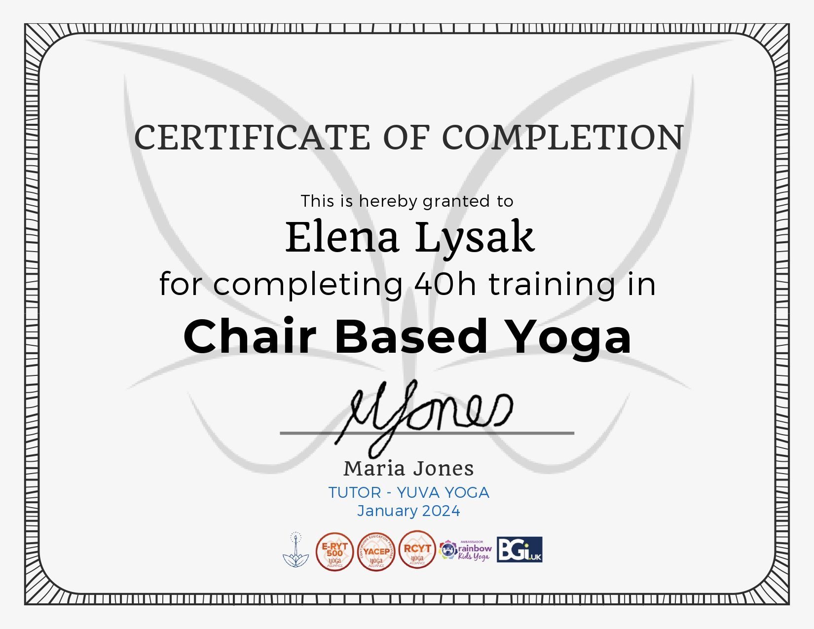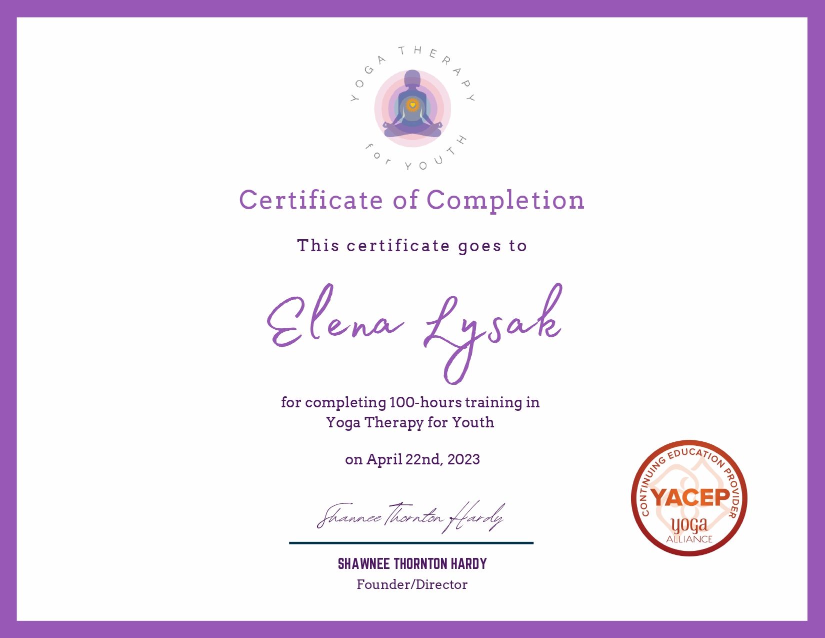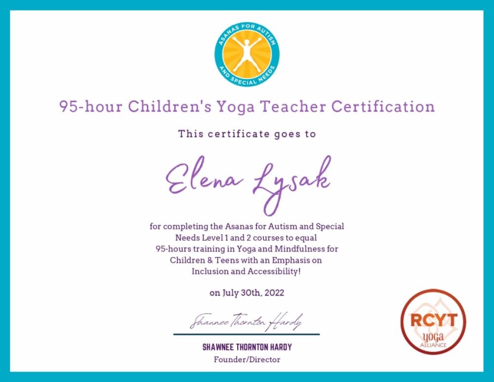 J’ai également suivi la formation en Yoga pour Enfants et Adolescents à besoins spéciaux, y compris autisme, TDAH, trouble d'intégration sensorielle, anxiété, dépression (RCYT 200).