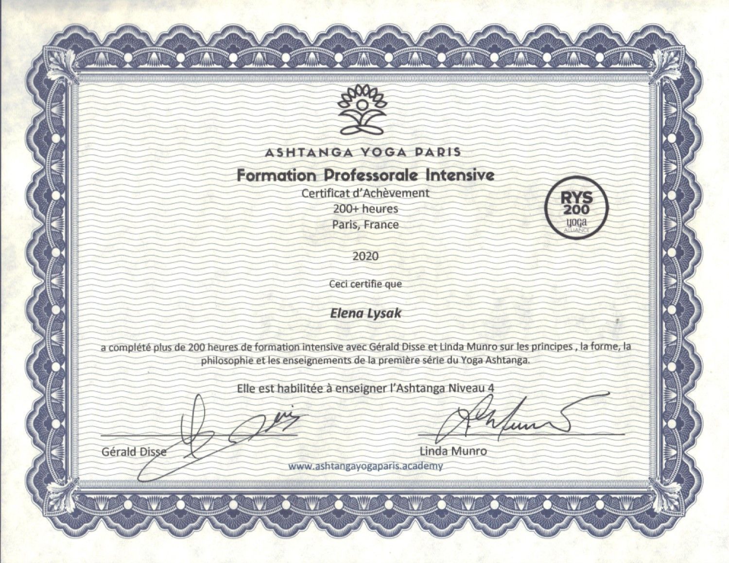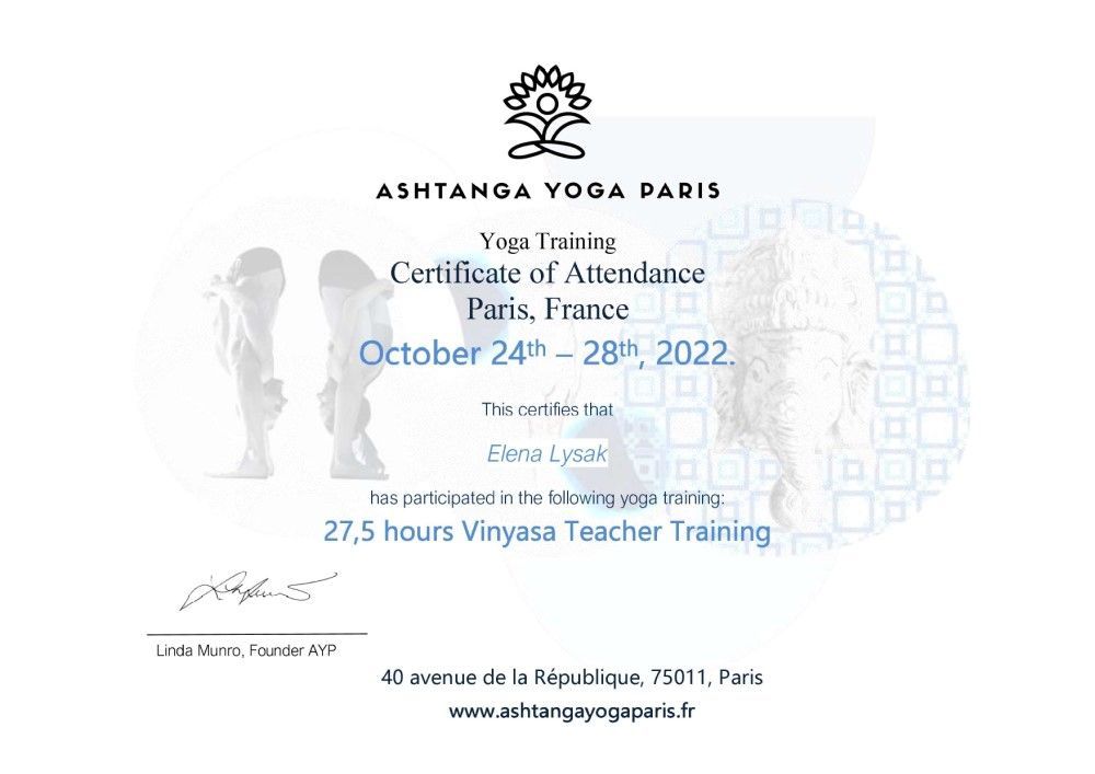 Professeur expérimenté (E-RYT 200) et formateur certifié Yoga Alliance (YACEP), j’enseigne depuis 2020 l’Ashtanga Hatha Yoga et Vinyasa Yoga. De même, je suis certifiée en Yoga Restauratif (50h Teacher Training avec Judith Hanson Lasater et Lizzie Lasater) et en Chair Yoga/Yoga sur Chaise (40h Chair Based Yoga Teacher Training avec Maria Jones). Je suis autorisée à enseigner le Hatha Yoga avec Yoga Wall (16h Yoga Wall Teacher Training avec Estefania LLedó).
