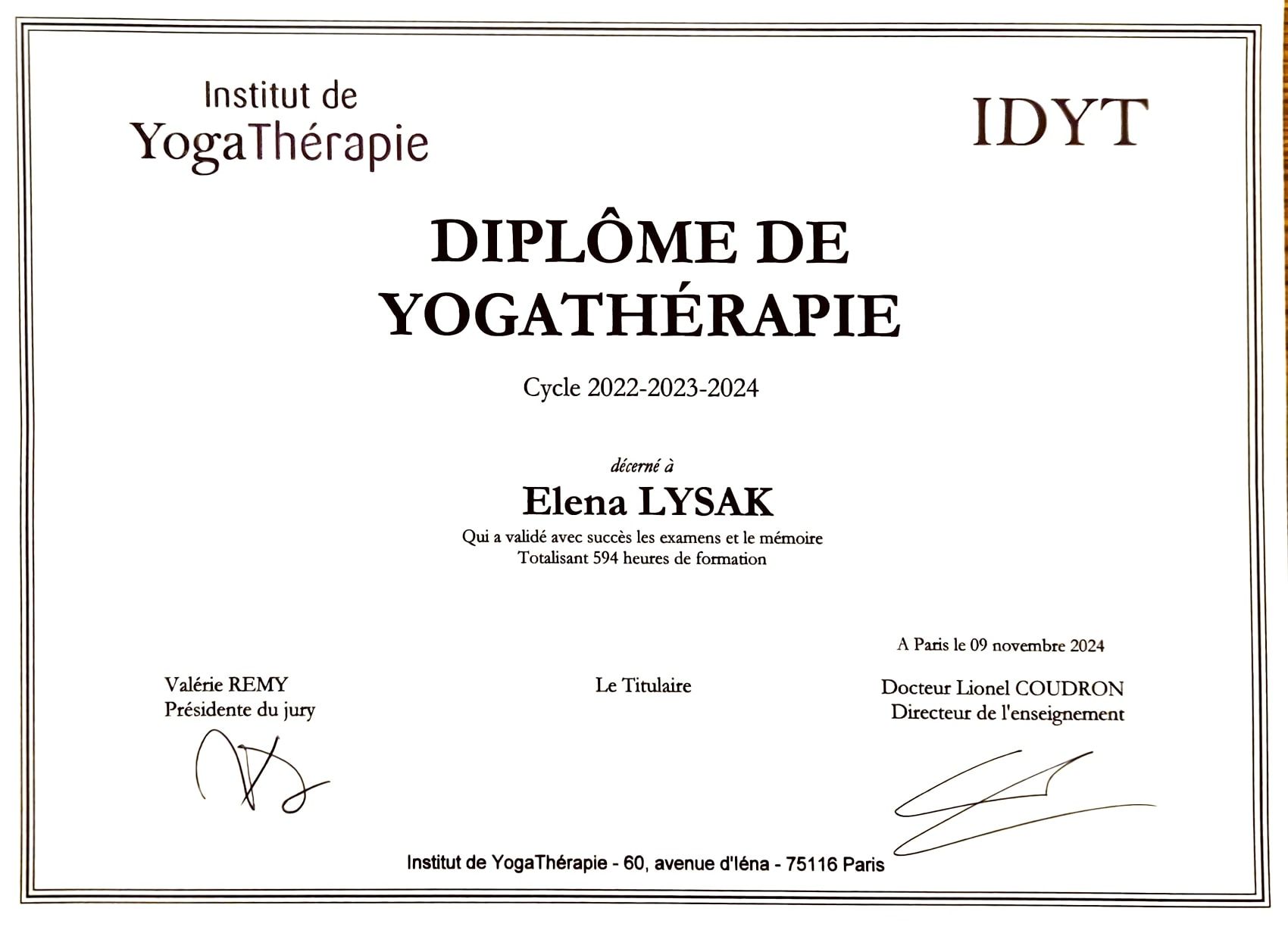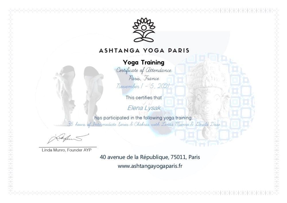 Toujours à la recherche de l’évolution professionnelle, j'ai obtenu en 2024 un diplôme en Yoga Thérapie (Institut de Yoga Thérapie de Lionel Coudron), technique qui allie l’expérience millénaire du yoga aux connaissances actuelles des sciences modernes.